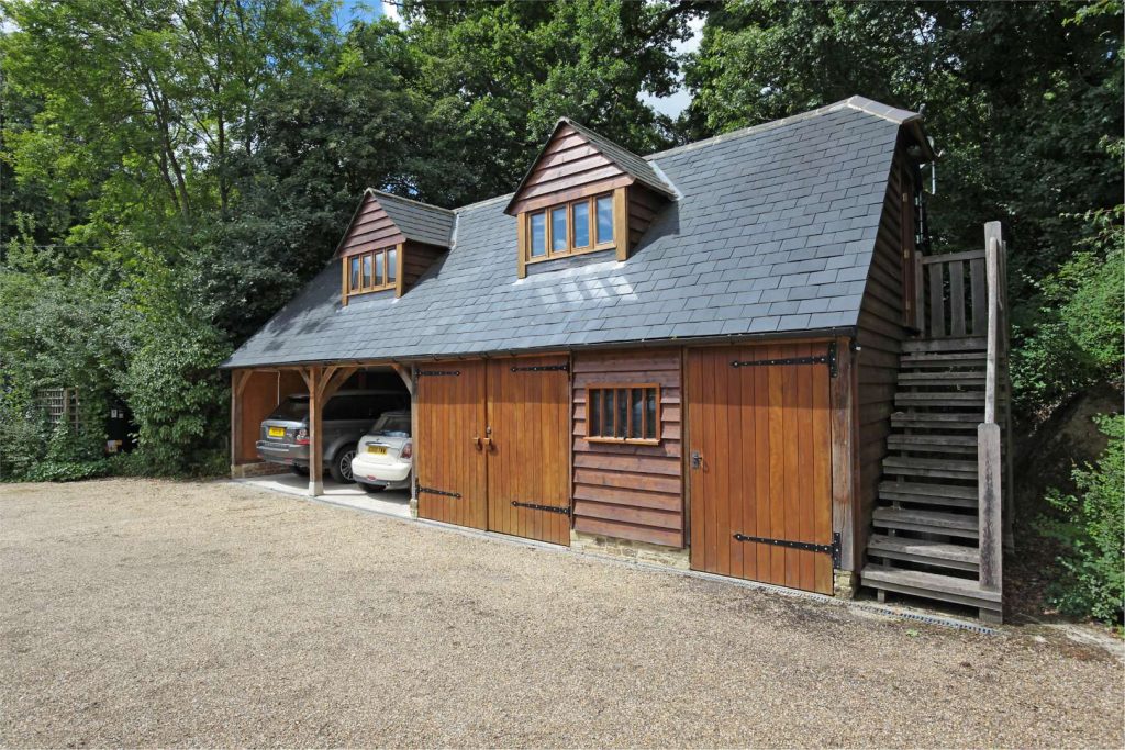 Four bay garage with 3 open bays and 1 enclosed with garage doors and a weatherboarded partition. External oak staircase to first floor, roof finished with natural slates and in…
