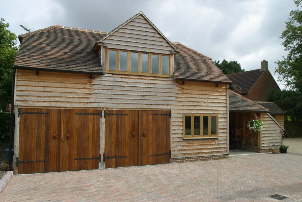 Two bay oak framed garage with hipped roof ends an aisle to the right and catslide roofs to the right and rear of the building.
