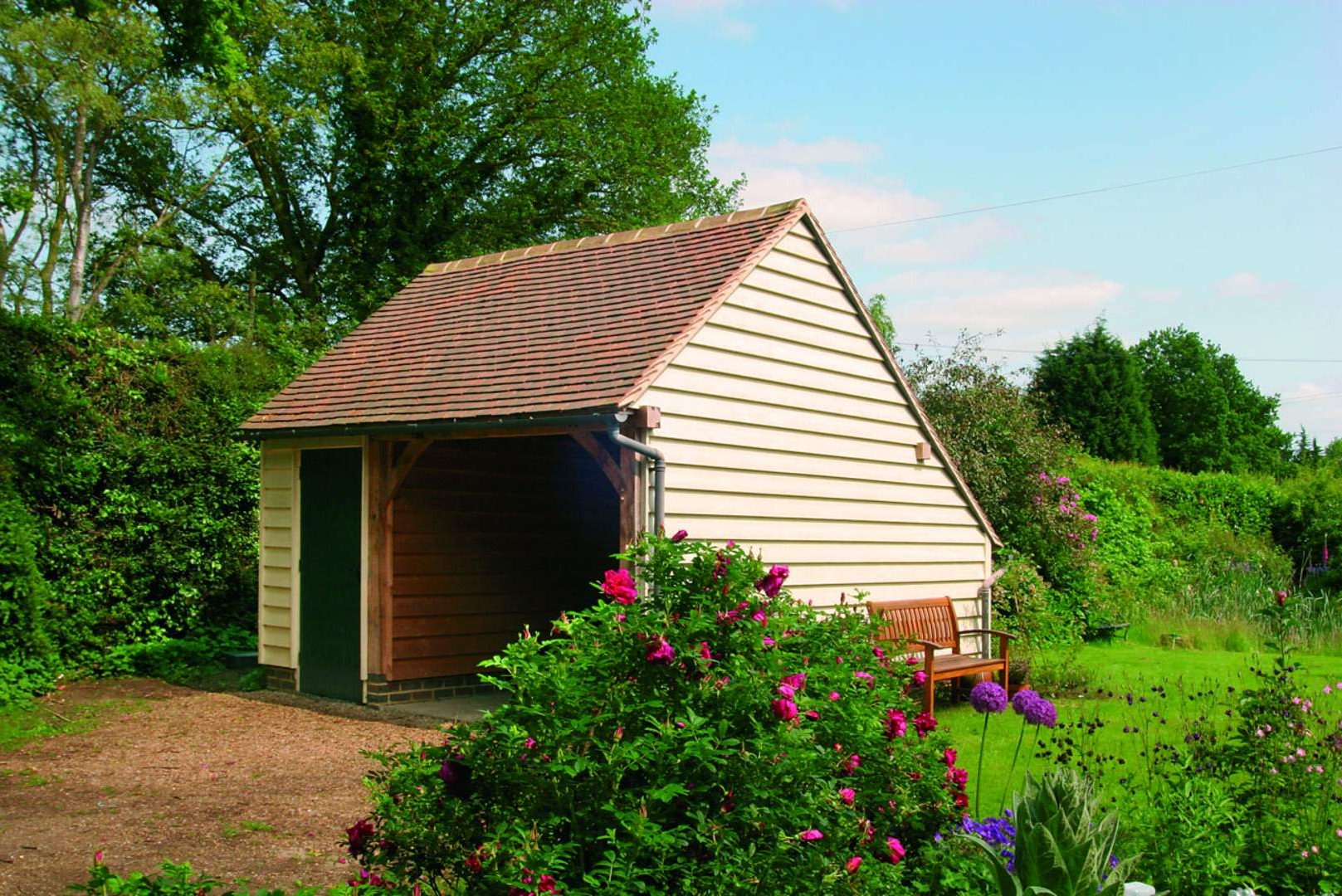 A single bay oak framed garage with an upper floor . The ground floor has an iroko garage door at the front, on the right there is a mullion window and a solid single door, at t...