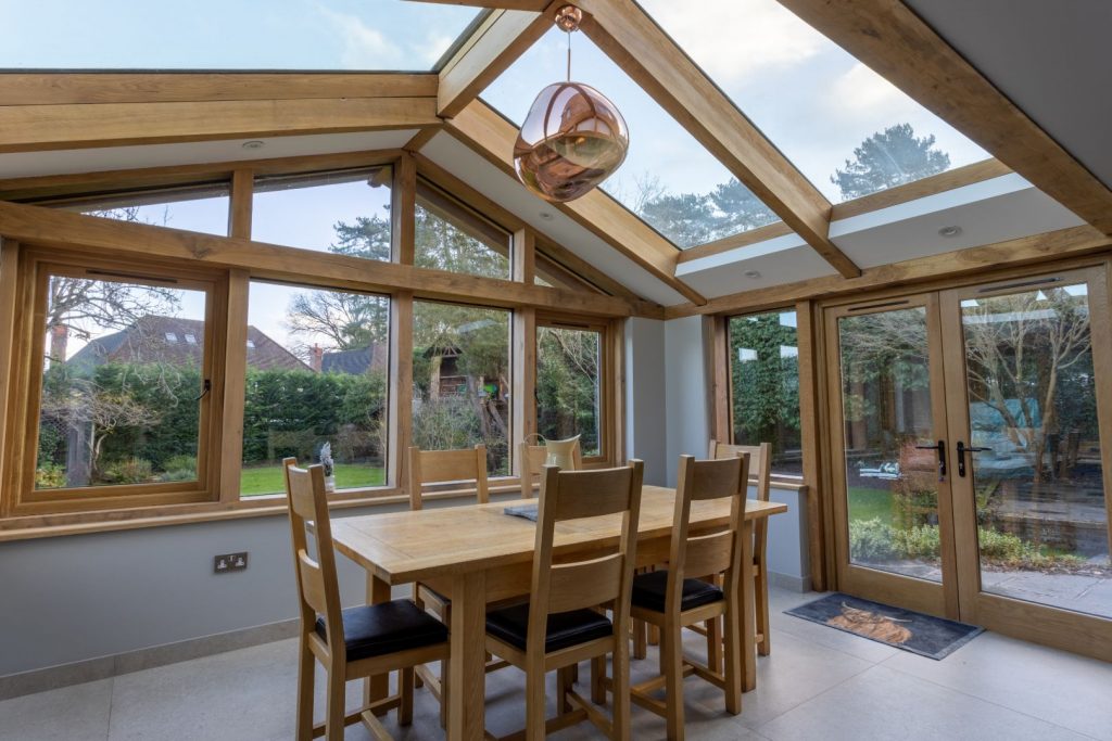 A glazed oak framed extension with flat top to roof to avoid first floor windows and an oak glazed lantern for extra light.