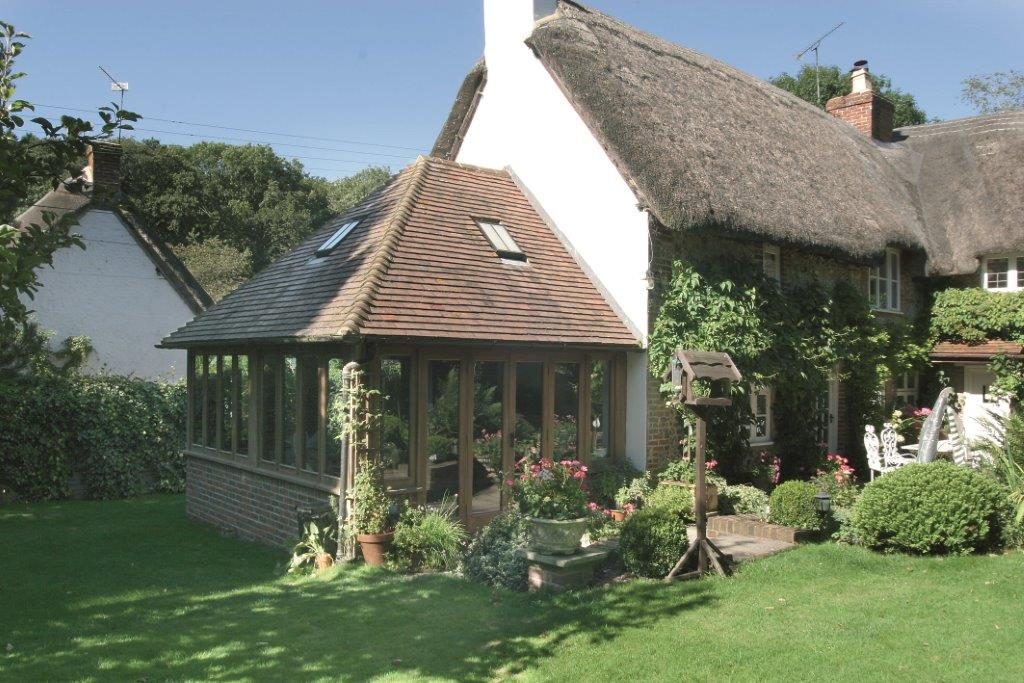 A glazed oak framed extension with flat top to roof to avoid first floor windows and an oak glazed lantern for extra light.