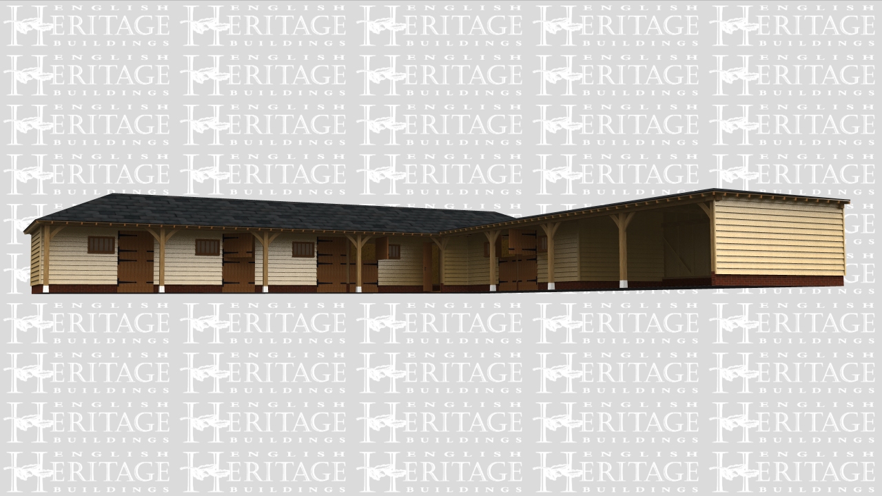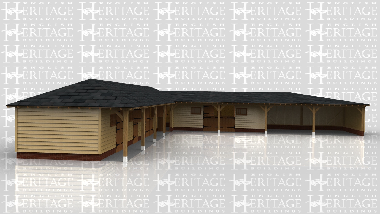 An L-shaped stable complex with 6 loose boxes, one tack room and 2 bays for storing hay and larger equipment.