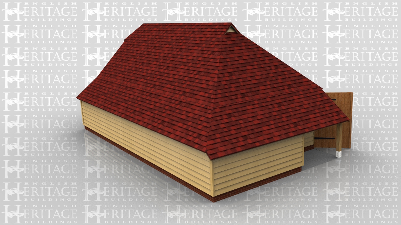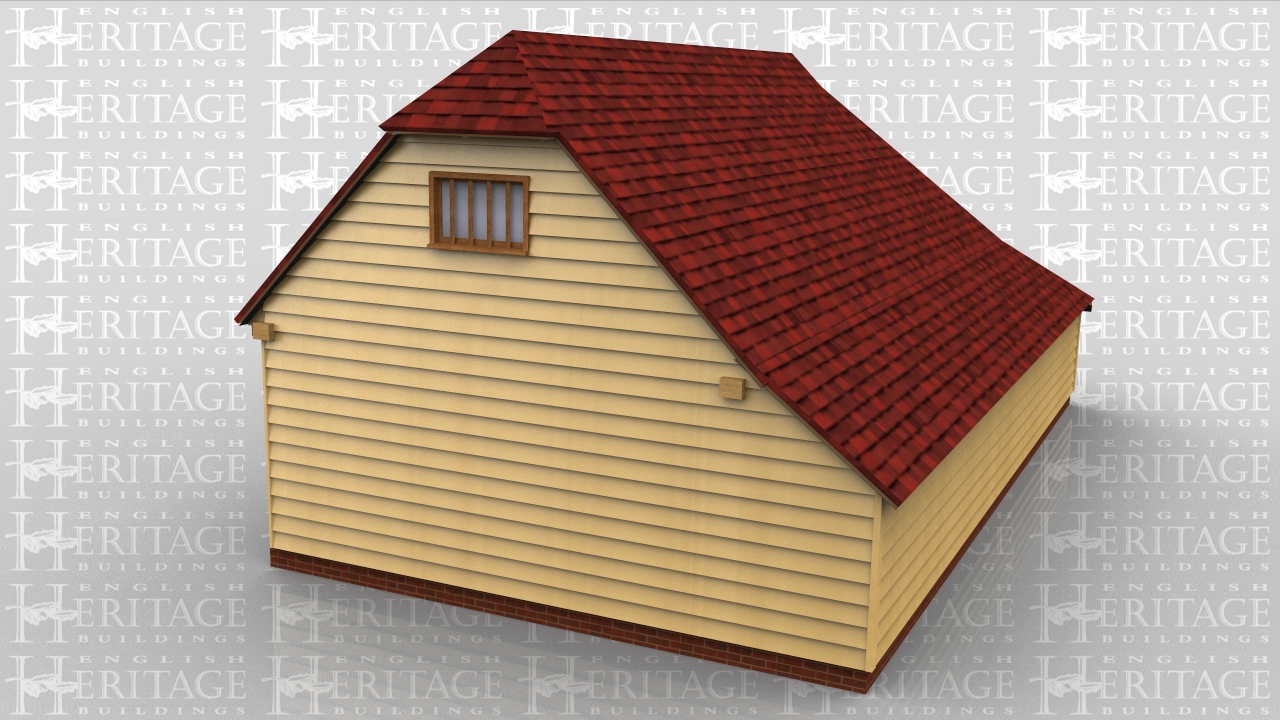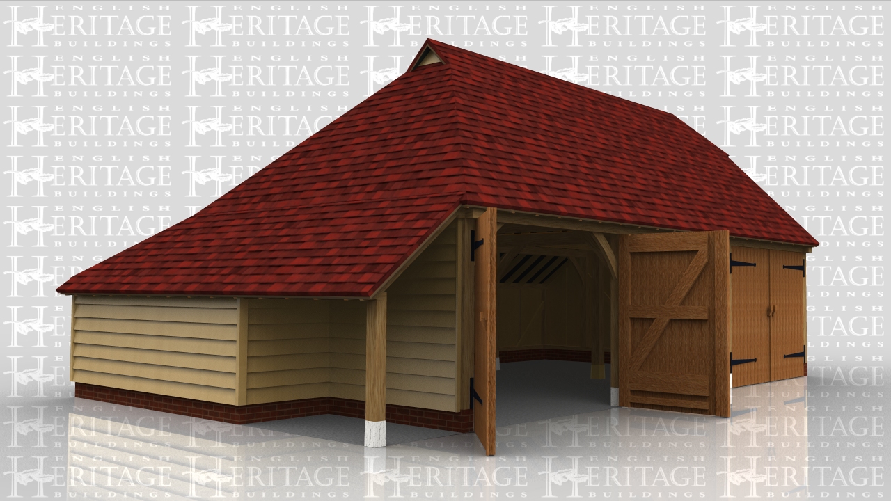 3 bay garage enclosed with garage doors. The first floor is for storage and reached via a hatch. There is a catslide on the left for both internal use and external log store.