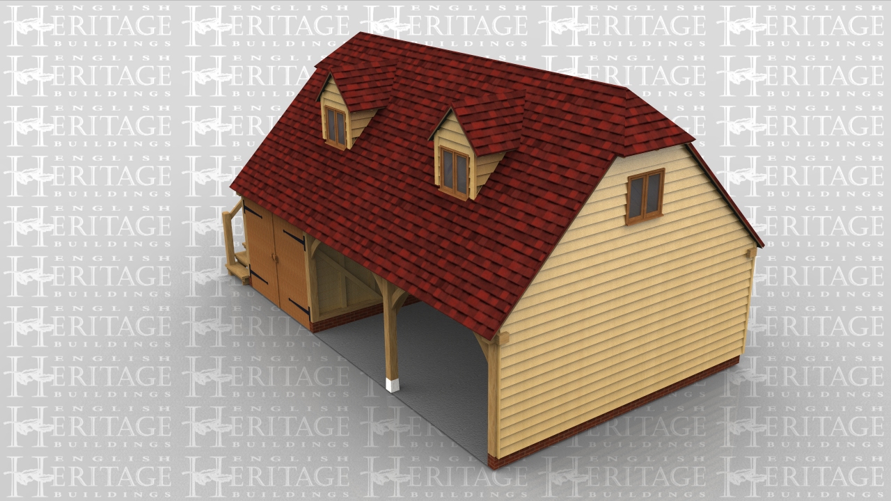 Three bay garage with the first bay enclosed with garage doors. Oak staircase to the left hand side giving access to the first floor which has 2 dormer windows.