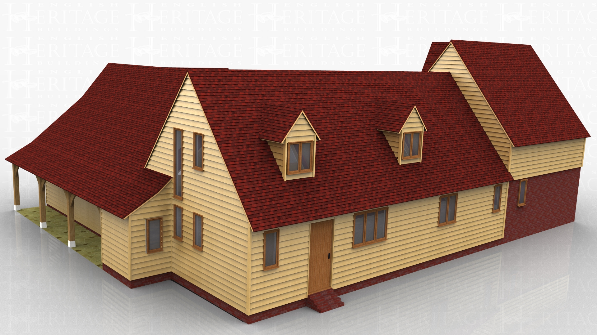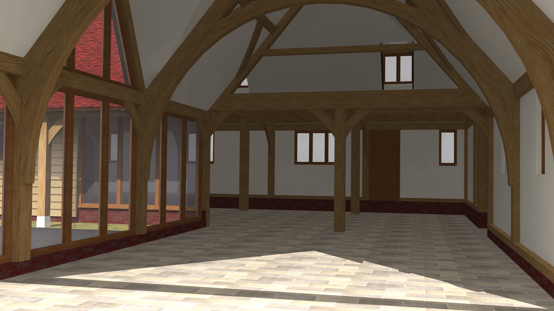 An L-shaped house designed for a customer who wanted a large light and airy living space provided by an open vaulted lounge with large glazed units all along one side including a stunning glazed gable area and vaulted landing overlooking at the top of the stairs. The upstairs area is provided by a sling brace design with a feature balcony running around two sides of the master bedroom making use of the beautiful views over the South Downs. Dormer windows and rooflights both provide additional natural light to the upper floor.