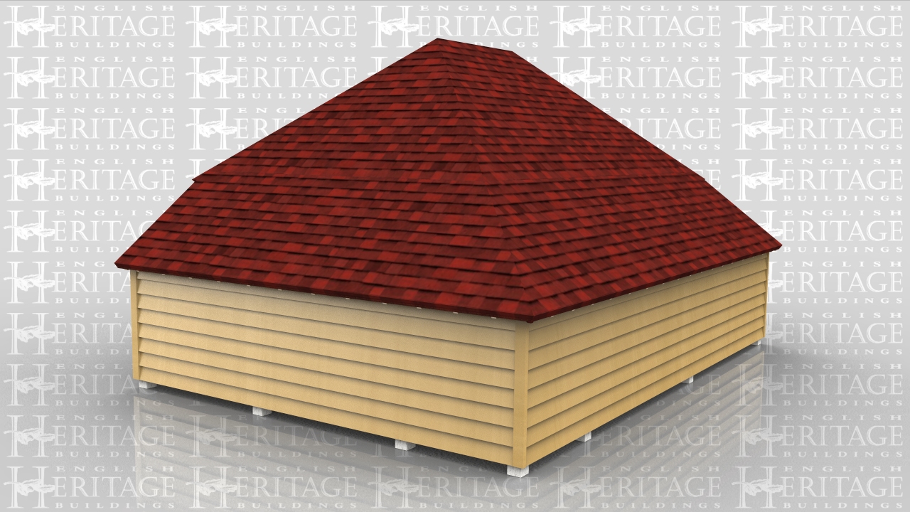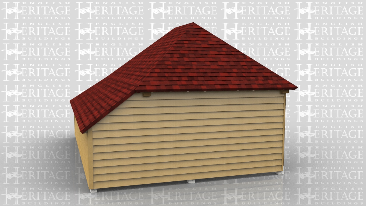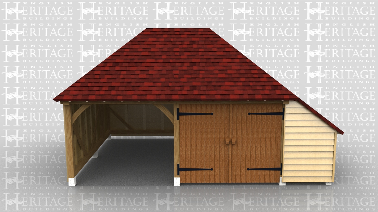 Two bay oak framed garage with central partition and garage doors to one side. This building sits on staddle stones on top of concrete pad foundations so there is no brickwork or oversite required.