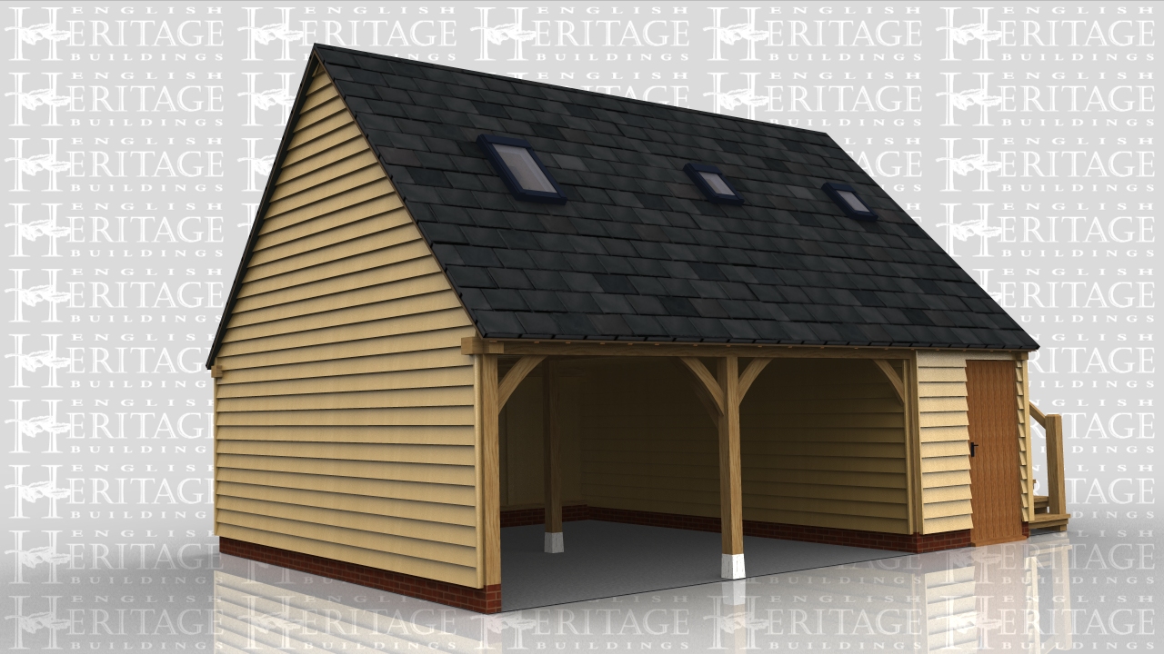 Two open garage bays with a secure store/workshop. External oak staircase to access first floor area.