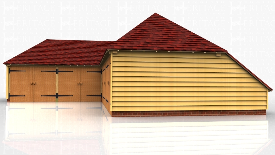An ‘L’ shaped oak framed garage complex comprising of 5 car bays all with garage doors to make one complete secure area with a large workshop area in the corner.