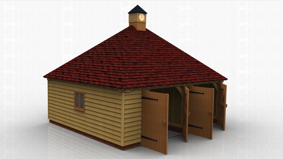 2 bay garage split into two secure parking bays with garage doors. Roof has an oak clock tower on top.