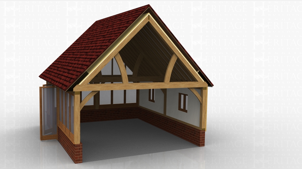 2 bay oak framed extension with glazing on two sides set on dwarf cavity brick walls. Gable end is completely glazed to give maximum light into the room.