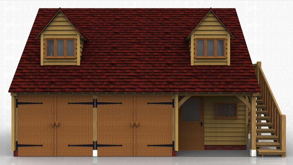 3 bay oak framed garage with external oak staircase up to first floor which has two dormer windows. There are two bays of secure parking with garage doors on the front and the third bay is a storage/workshop area.