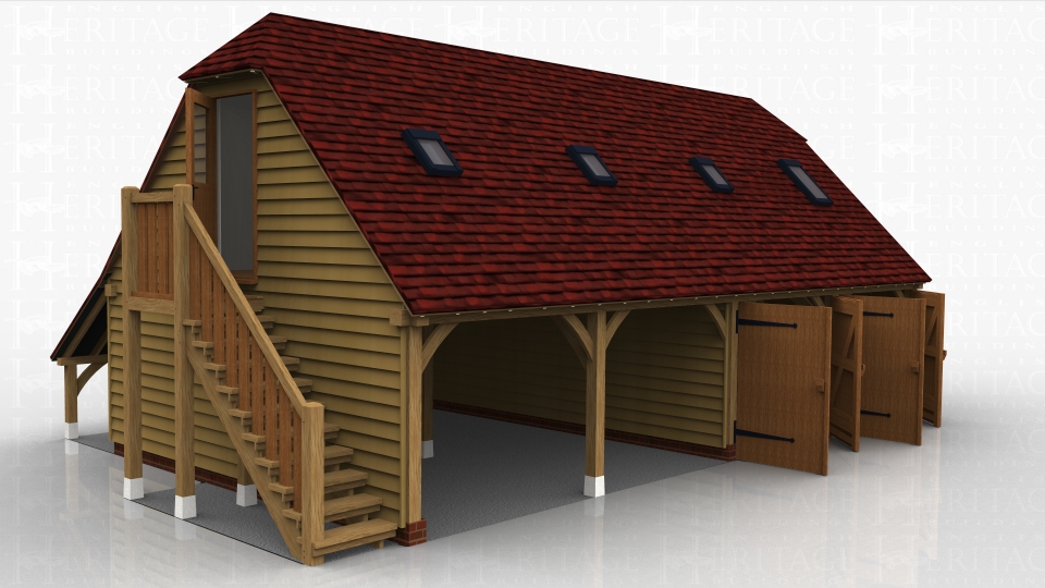 Four bay oak framed garage with external oak staircase leading up to the first floor space that has 4 rooflights. There are two open car bays and two enclosed with garage doors.