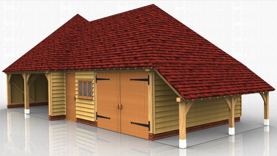 A complex of a square double open oak car port bays with a workshop and secure garage bayand log store on the right hand side.