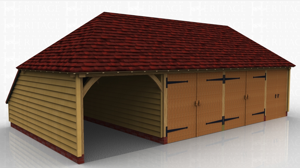 Four bay oak framed building with one open garage bay, 2 secure garage bays with garage doors and a store area with double doors on the front.