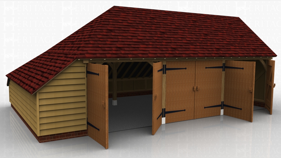 3 bay oak framed garage with 3 sets of garage doors and an internal storage area under the side catslide roof.