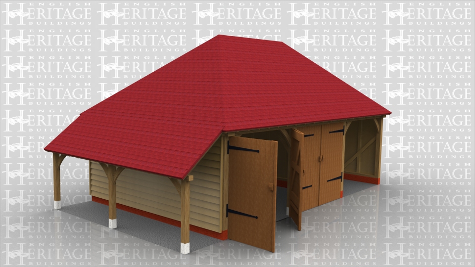 3 bay oak framed garage with slightly higher eaves height to accommodate a camper van. 2 bays are secured with garage doors and one bay is left open.
