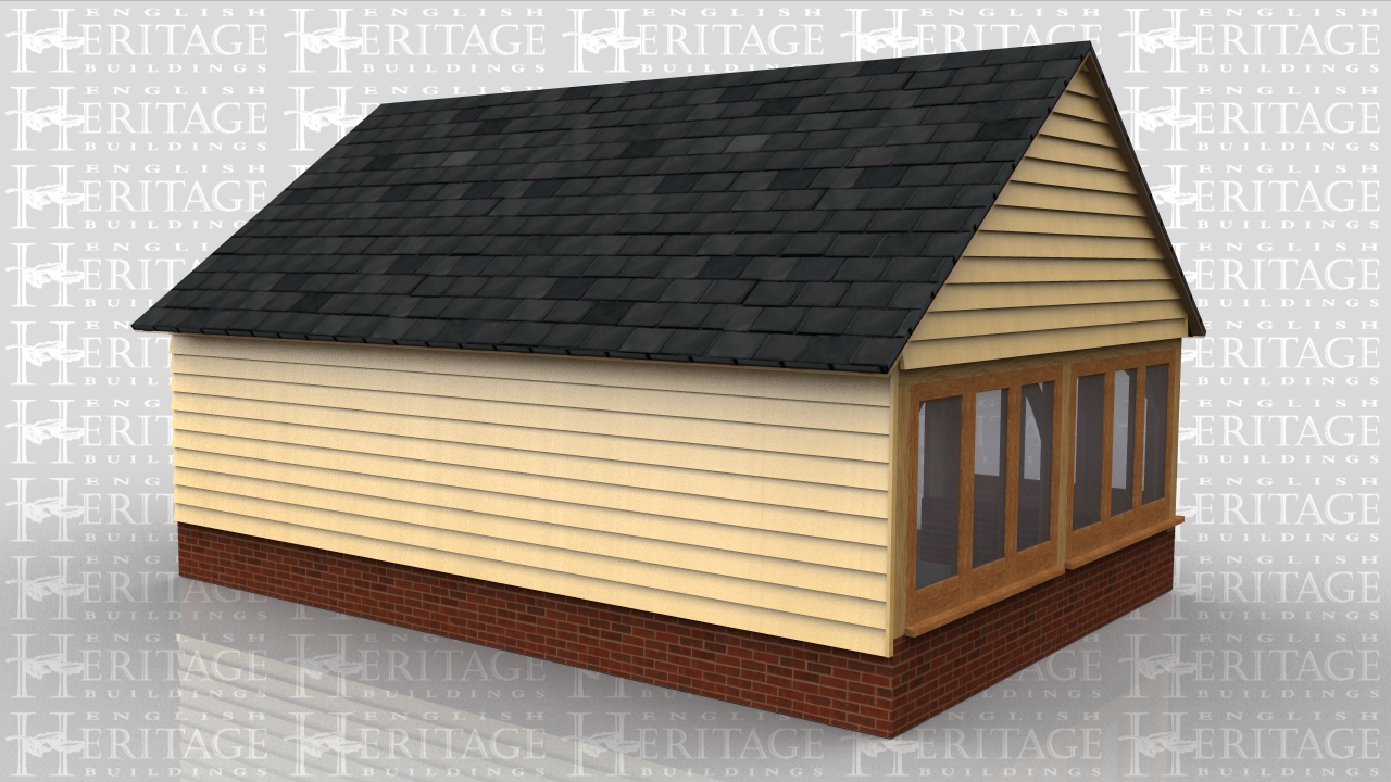 Three bay garden room extension to a house sitting on a dwarf cavity brick wall. Glazing along 2 sides and the third side has weatherboard with insulation and plasterboard on the inside. There are also 3 feature trusses in the roof.