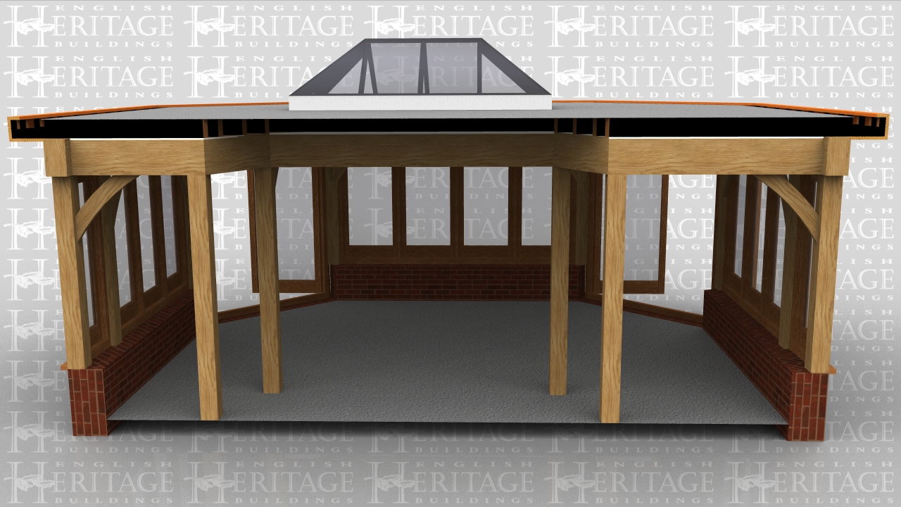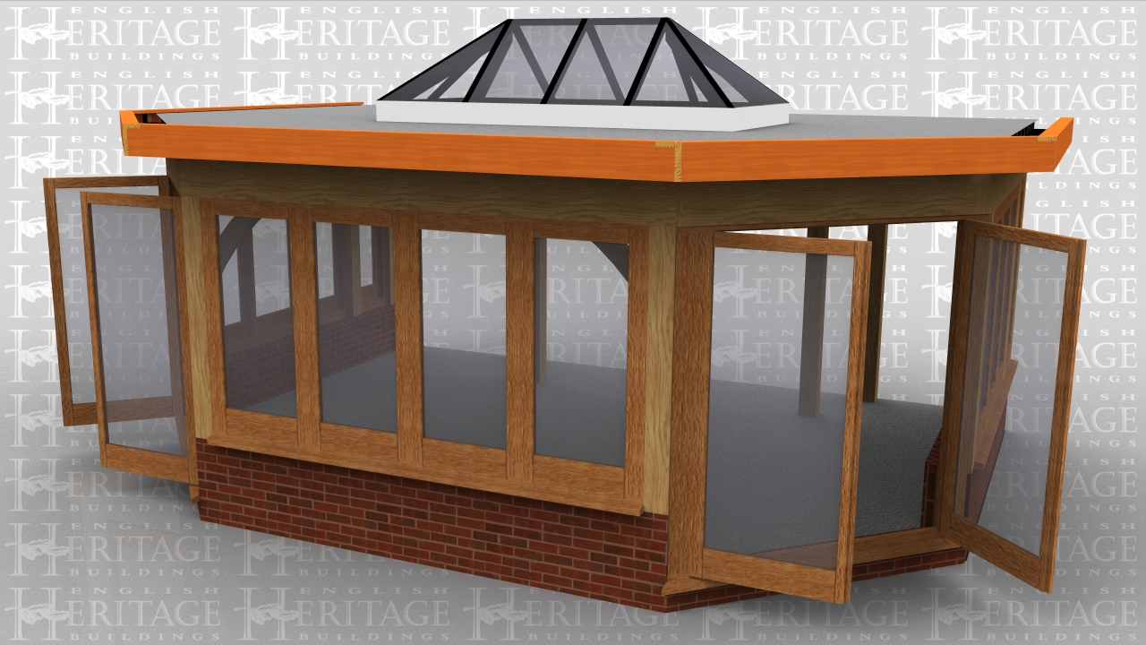 An oak framed garden room extension with an octagonal end. There is glazing on all sides and it has a flat roof with glazed roof lantern to get under a first floor window. The glazing is sitting on a dwarf cavity brick wall with 2 sets of glazed doors in the angled corners.