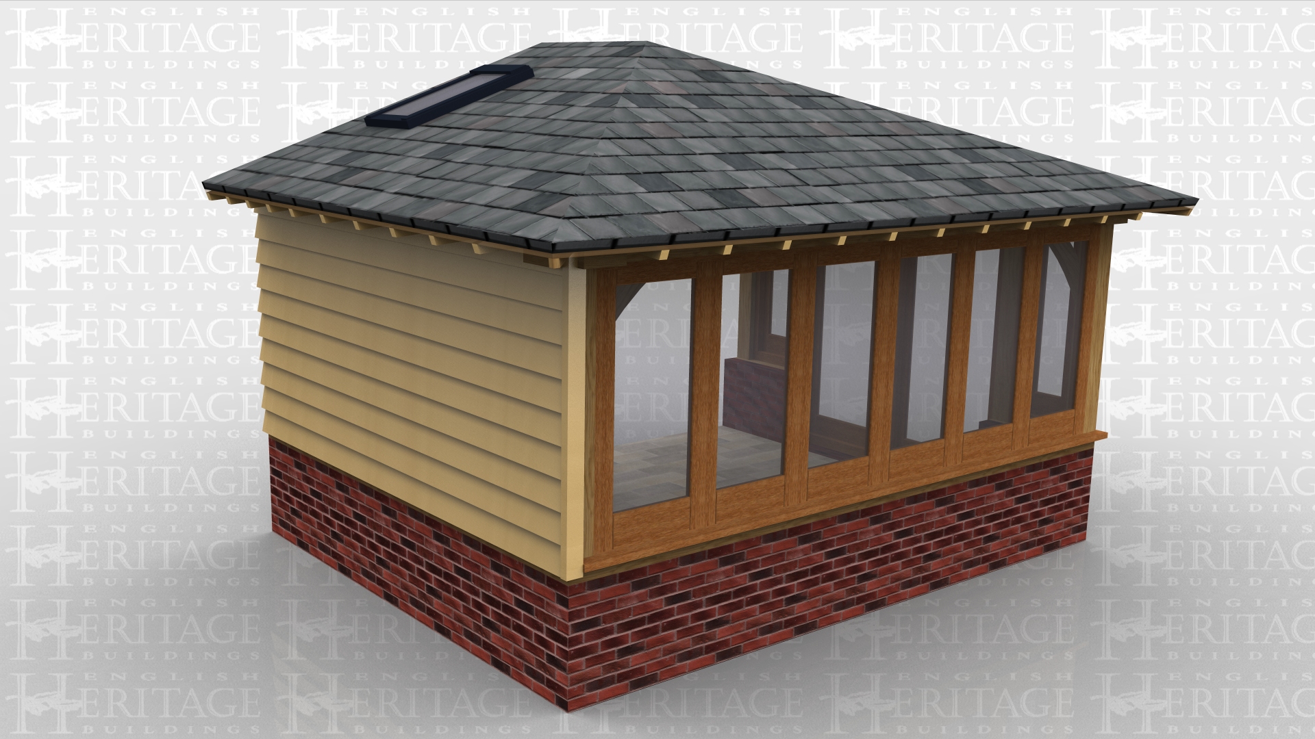 A small garden room extension with two sides of glass and the third with weatherboard. All the glazing, apart from the doors, sits on a dwarf cavity brick wall. The building has a low pitched roof with slates and two rooflights.
