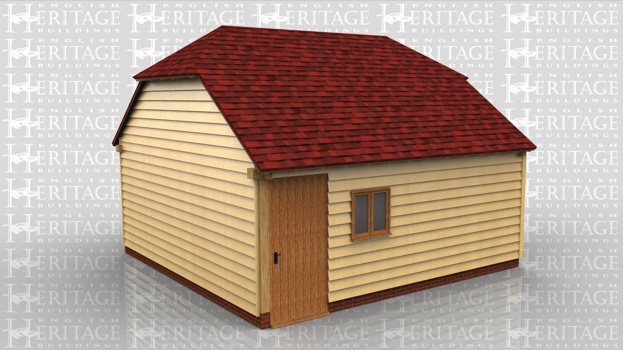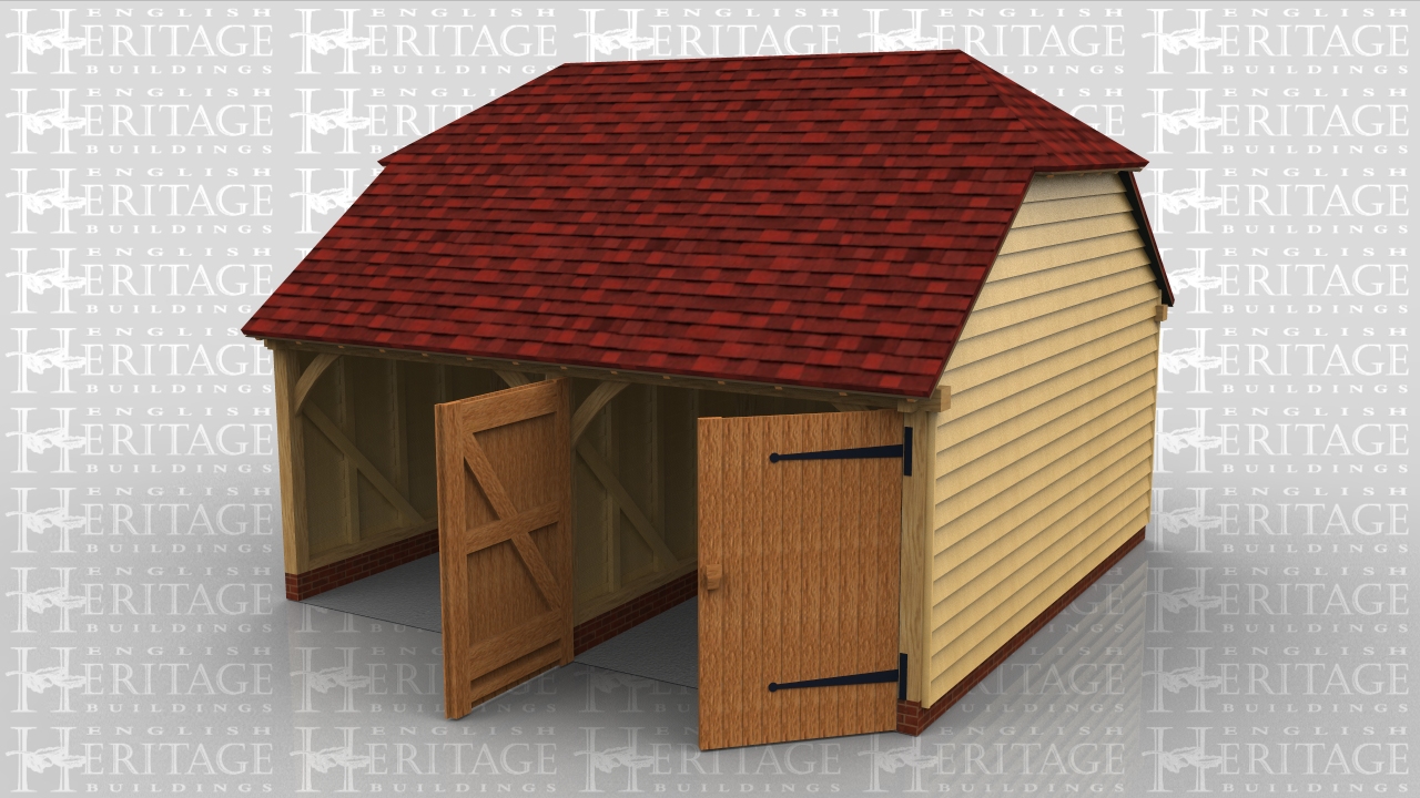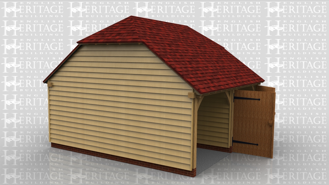 A two bay garage with barn hip ends. On bay is open at the front and the other bay is secured with garage doors. At the back of the enclosed bay is a single door and a 2 light casement window.