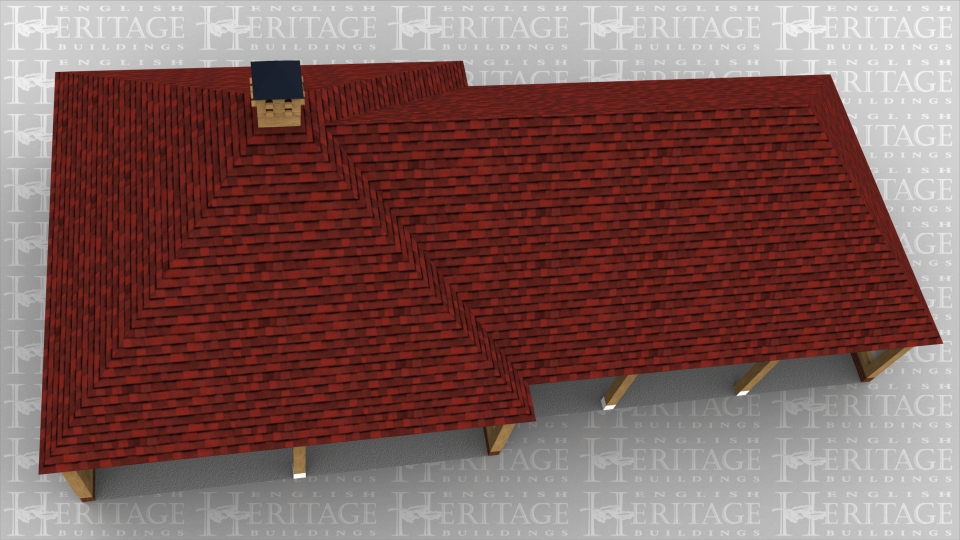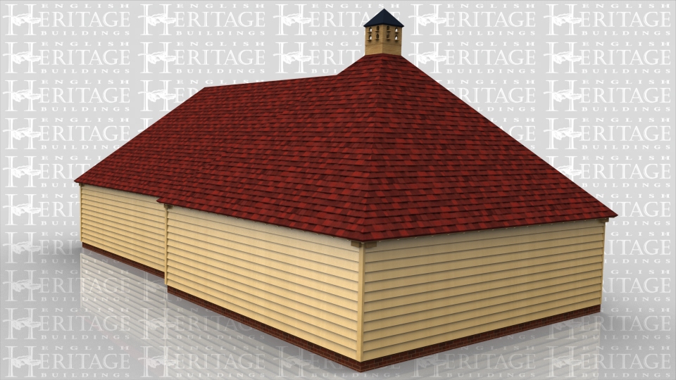 This building comprises of two frames. The first is a large square frame with hipped roof and a dovecote at the top. The second frame attached to it comprises of 3 open bays, 2 for cars and the other slightly smaller for garden machinery or motorbikes.