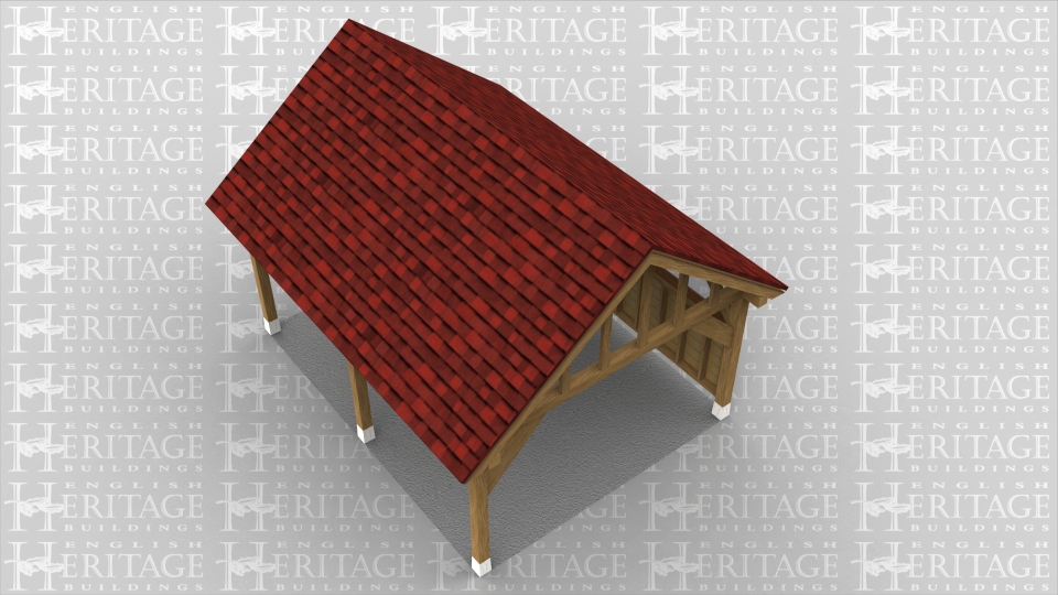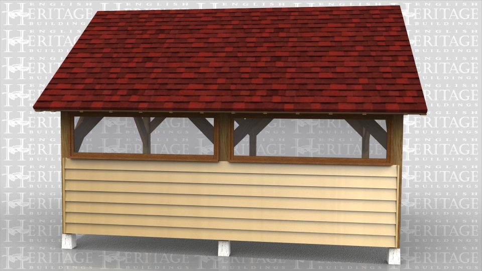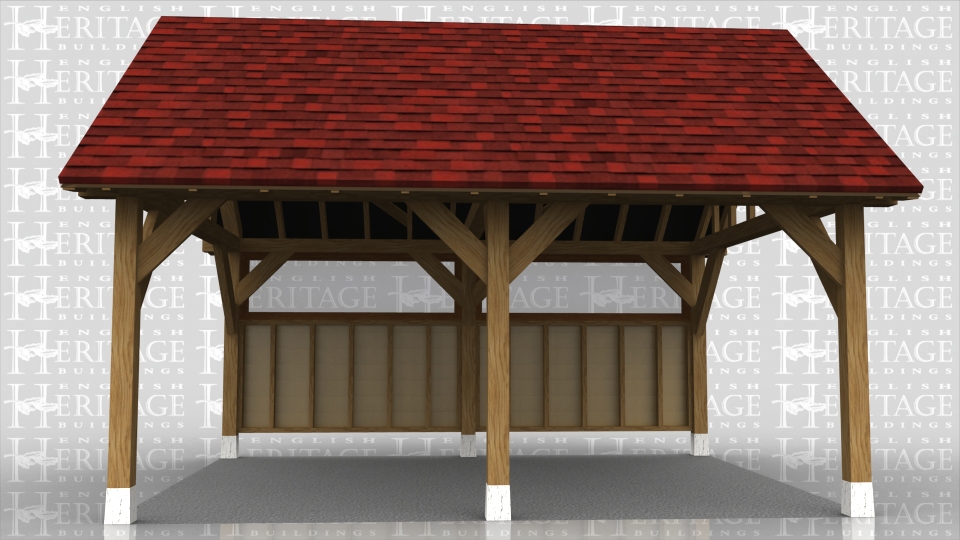 This oak framed car port has two bays, with one enclosed side to the front and the other sides open. The front side has two small windows and softwood weatherboarding.