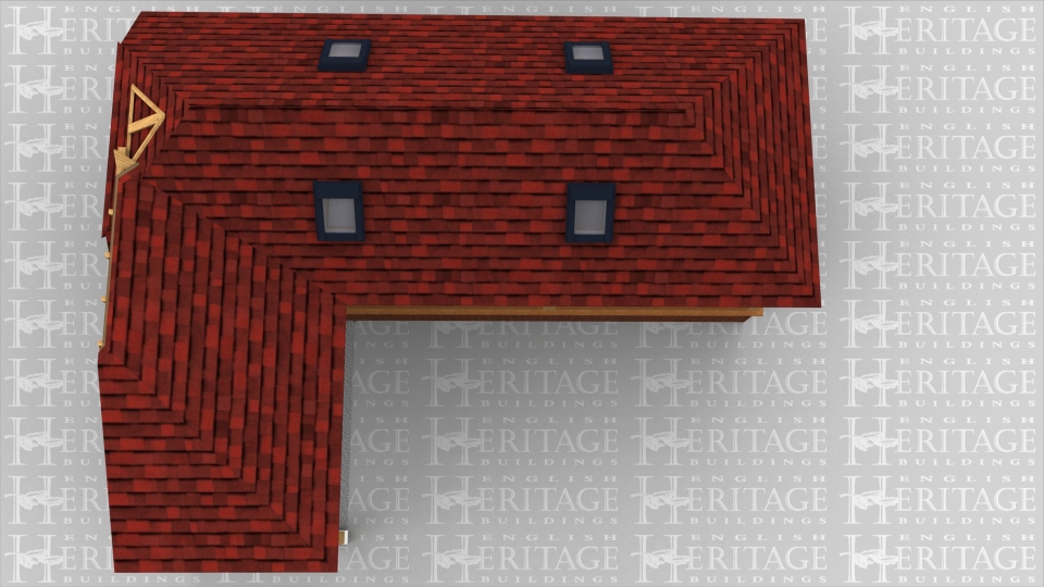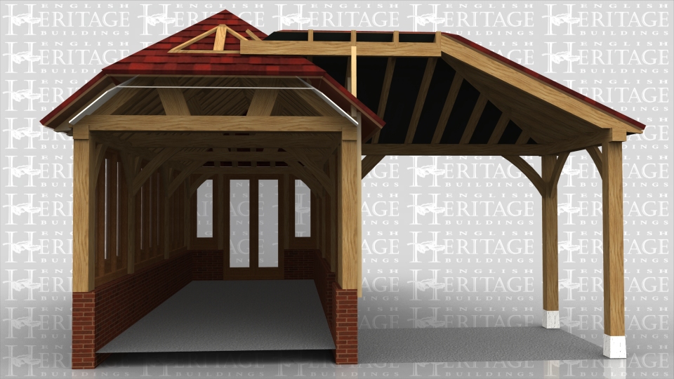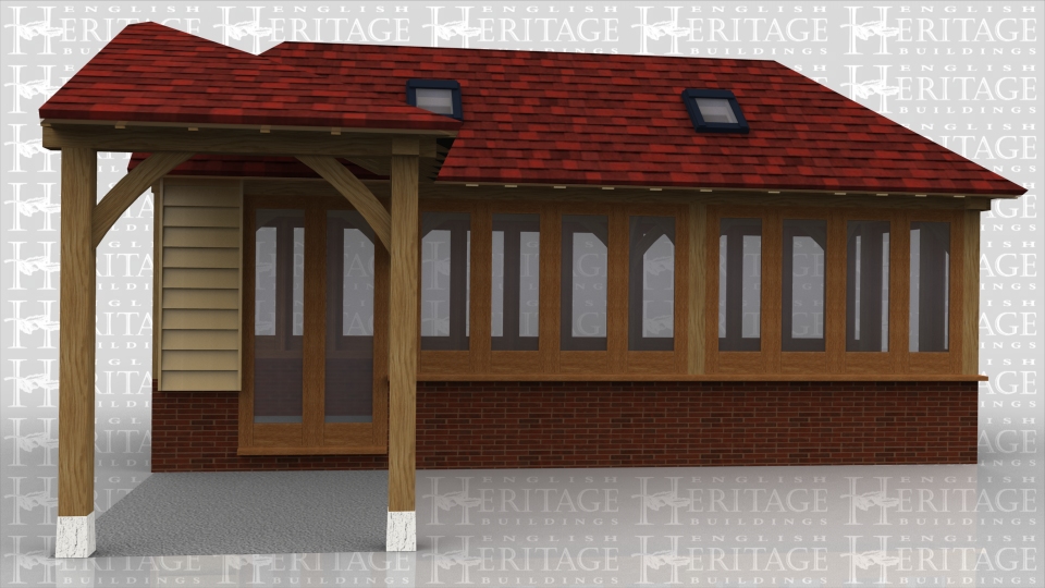 A fully glazed oak frame extension sitting on a dwarf brick wall with a covered walkway to the entrance doors. Four velux roof lights help to bring as much light into the building as possible while the barn hip roof end where the extension adjoins the house allows clearance to the existing house upstairs window.