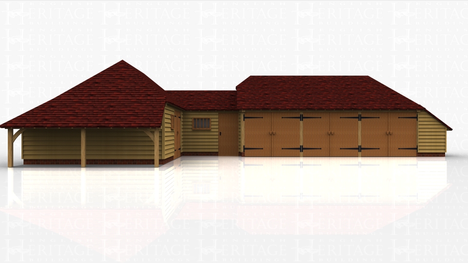 This oak framed complex has a three bay enclosed garage, a link building and another three bay enclosed garage. The first garage has one set of garage doors to the front and a mullion window. There is an enclosed store to the rear and also an open store to the left hand side. The link building is accessed via a single door to the front and also has a mullion window. The second three bay garage has three sets of garage doors to the front and and enclosed store to the right hand side.