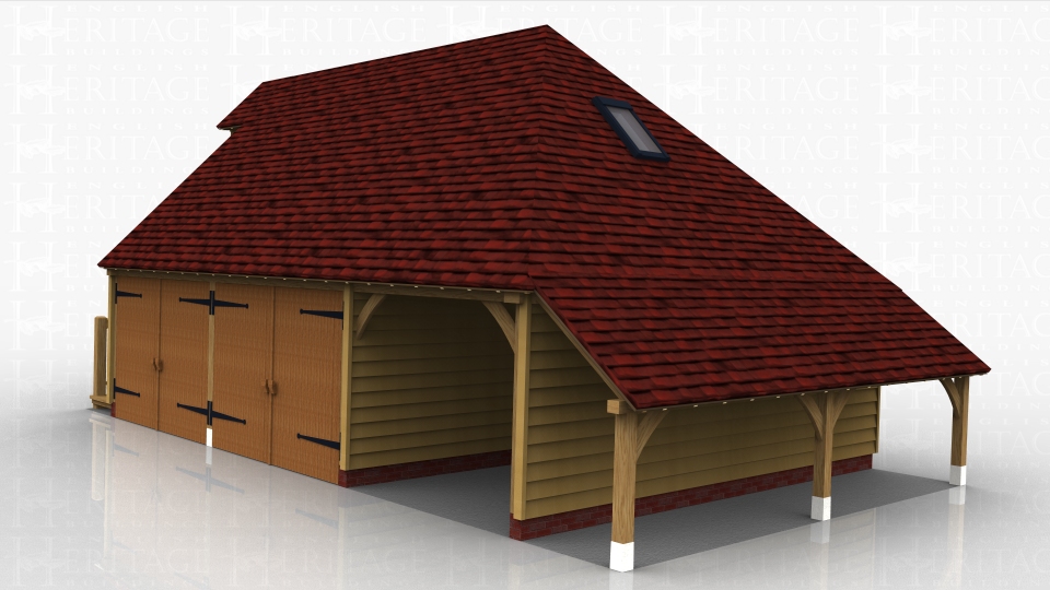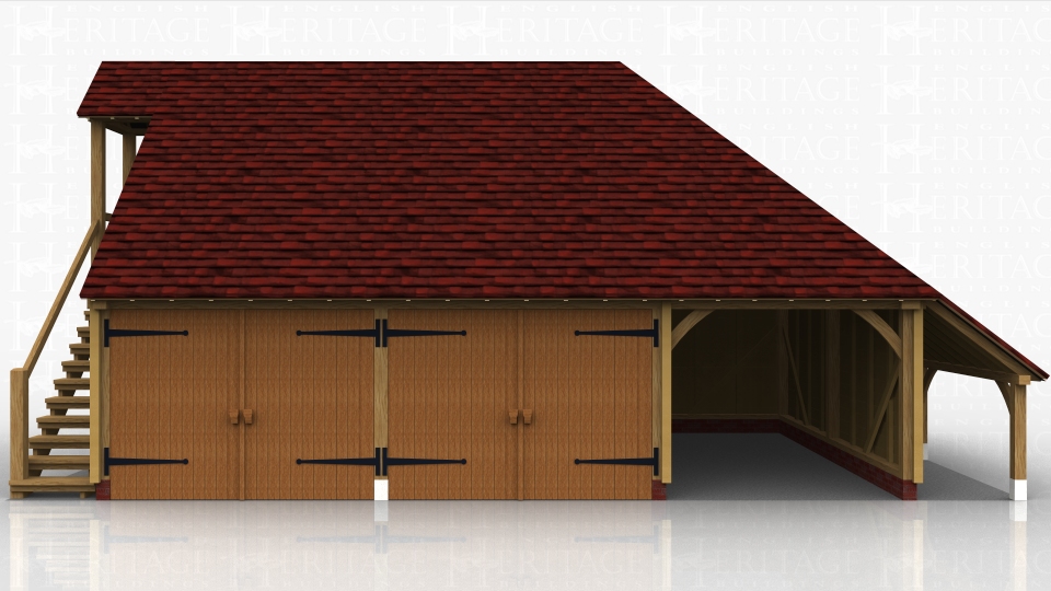This oak framed two storey garage has two enclosed bays and one open bay. There is an open store to the right hand side. The first floor is accessed via an external oak staircase and there is a half glazed door, with a small porch to cover the staircase.There is trimming for one rooflight on the right hand side.