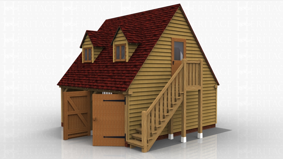 This is a two bay oak framed garage with room above. The ground floor has 2 garage bays, one open fronted and the other enclosed by a partition and a pair of garage doors. There are 3 mullion windows in the garage areas. There is an external oak staircase leading to a half glazed single door which accesses the first floor. There are 4 dormer windows suitable for two pane casement windows and a 3 pane escape casement window in the gable end.