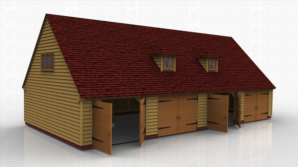 This oak framed two storey garage building has four enclosed bays. Each bay is accessed via a set of standard garage doors to the front. The first floor is accessed by an external oak staircase and a half glazed door. On the first floor there are two dormers to the front with two pane windows. There is also a three pane window to the left hand side.