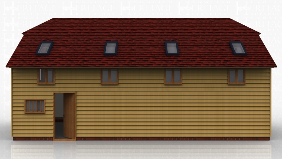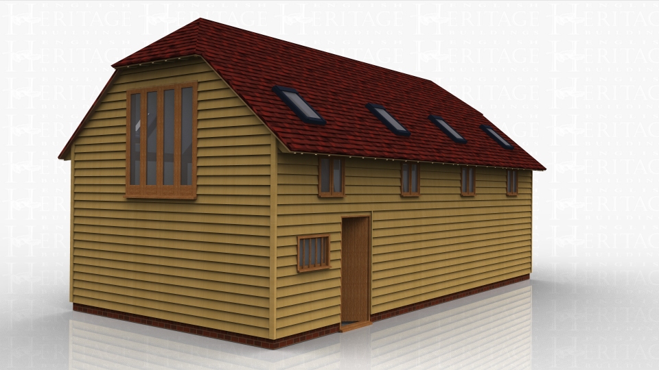 This oak framed building uses a sling brace frame in order to raise the eaves height.The building is formed of four bays, three open and one enclosed. The enclosed bay is accessed via a single door to the front and a mullion window. The three open bays are enclosed to the front and open to the rear, and each bay has a two pane window on the first floor. There are four full length garden room windows on the first floor to the left hand side, and trimmings for four rooflights.