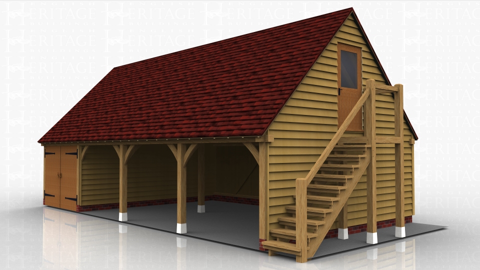 This two storey oak framed garage has four bays, one enclosed and three open. The enclosed bay is accessed via a set of garage doors to the front of the building.The first floor is accessed via an external oak staircase on the right hand side and a half glazed door. There is also a two pane window on the left hand side of the first floor.
