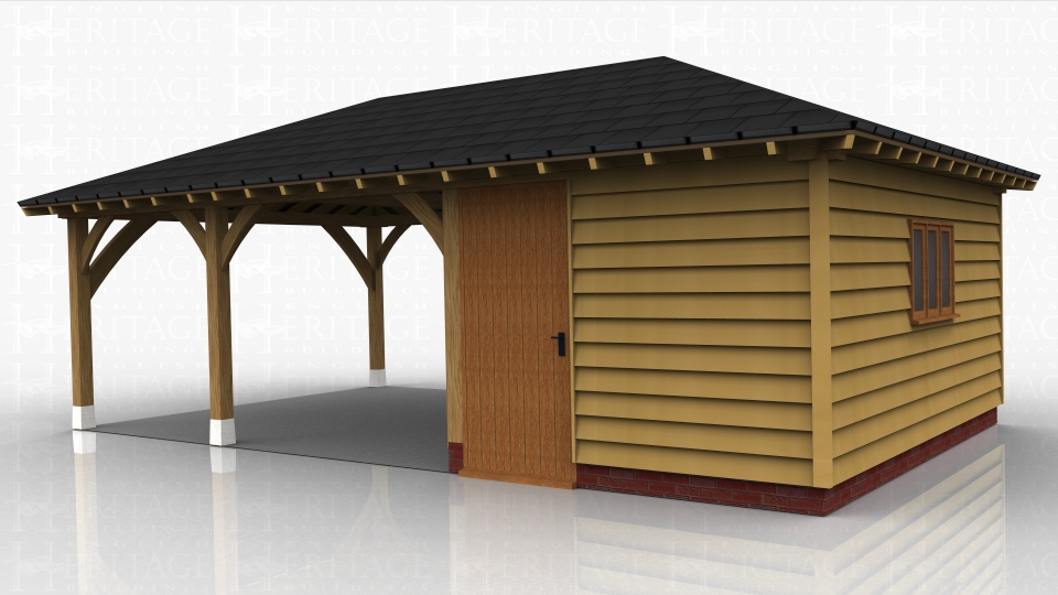This oak framed garage has three enclosed bays; two of these are accessed on the right hand side of the building, as one is open and the other has a set of garage doors. The bay to the left is accessed by a single door and has a first floor window. There is also an open logstore to the left. There are trimmings for two rooflights.