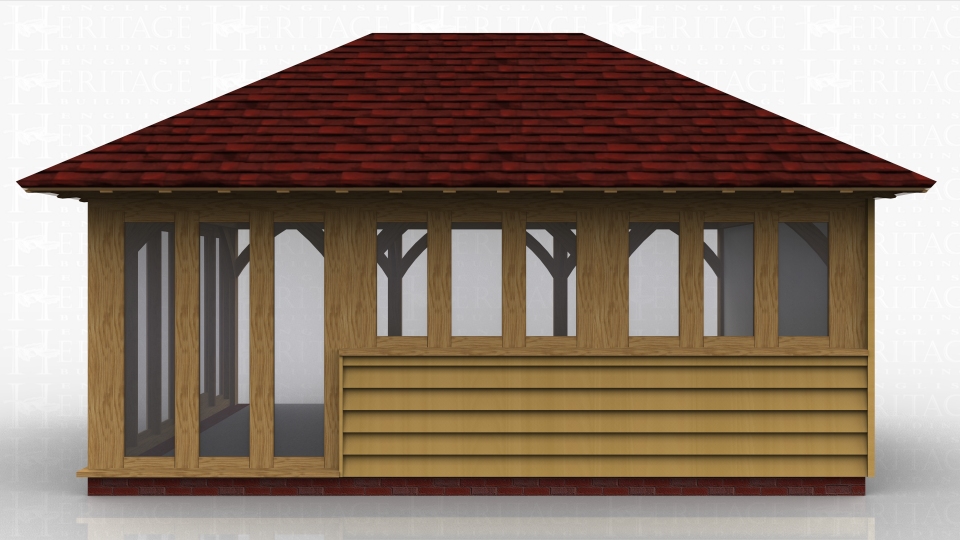 This oak framed garden room has full length glazing to the left hand side and to the front of one bay, with a solid wall to the right and two three pane windows to the front. The frame is designed to be attached to an existing building at the front.