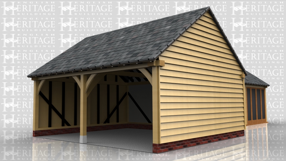 This oak framed home leisure building is formed of two different frames. The first frame is a two bay open garage, and attached to the rear is a three bay garden room. The garden room has a solid wall to the rear and two fully glazed bays to the front. The right hand wall is also fully glazed with full length garden room windows.