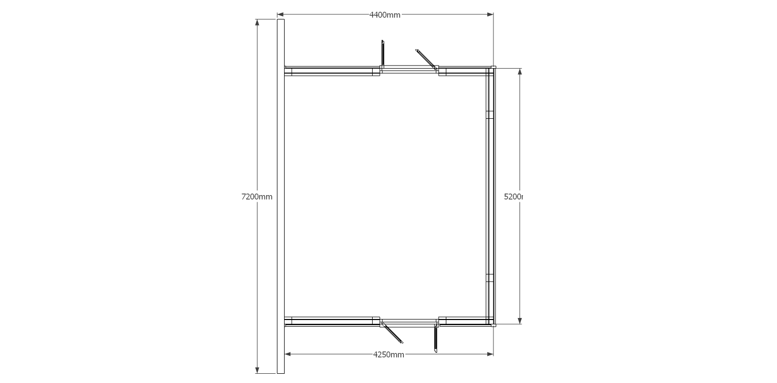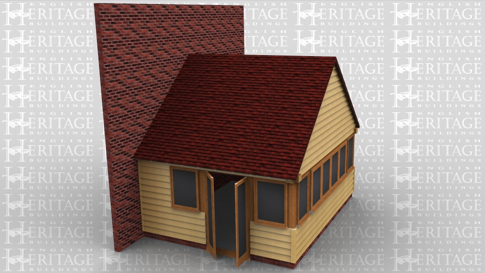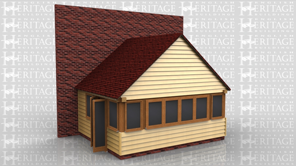 This oak framed home leisure building is designed to be attached to an existing building on the left hand side. The front, right and rear sides of the building all have single pane square windows the entire length of the building, with a pair of opening garden room windows to the front and rear.