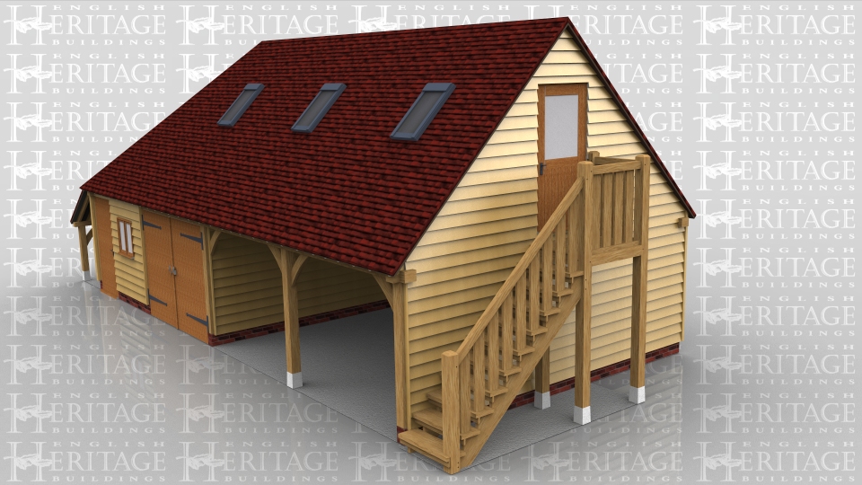 This two storey oak framed garage has four bays; two enclosed and two open. Access to the first floor is via the external oak staircase to the right hand side and a half glazed door. The first enclosed bay has a single door to the front and a two pane window, and is designed to be used for storage. The second enclosed bay has a set of garage doors. There is an open logstore to the left hand side of the building and trimming for three rooflights upstairs.