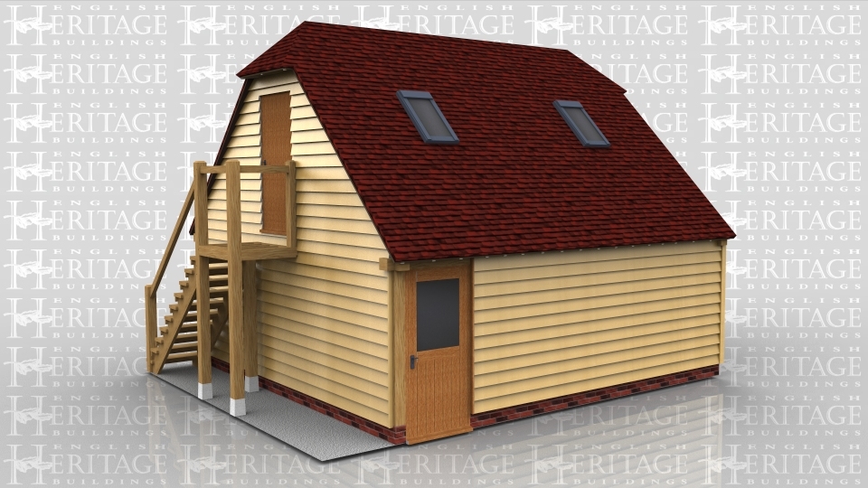 This two storey oak framed garage has two enclosed bays. The first bay is accessed via a set of garage doors to the front and the second has a single door to the rear. there is a three pane window to the front as well as to the right side of the first floor. The first floor is accessed via an external oak staircase to the right with single door at the top. The upstairs also has trimmings for four rooflights.