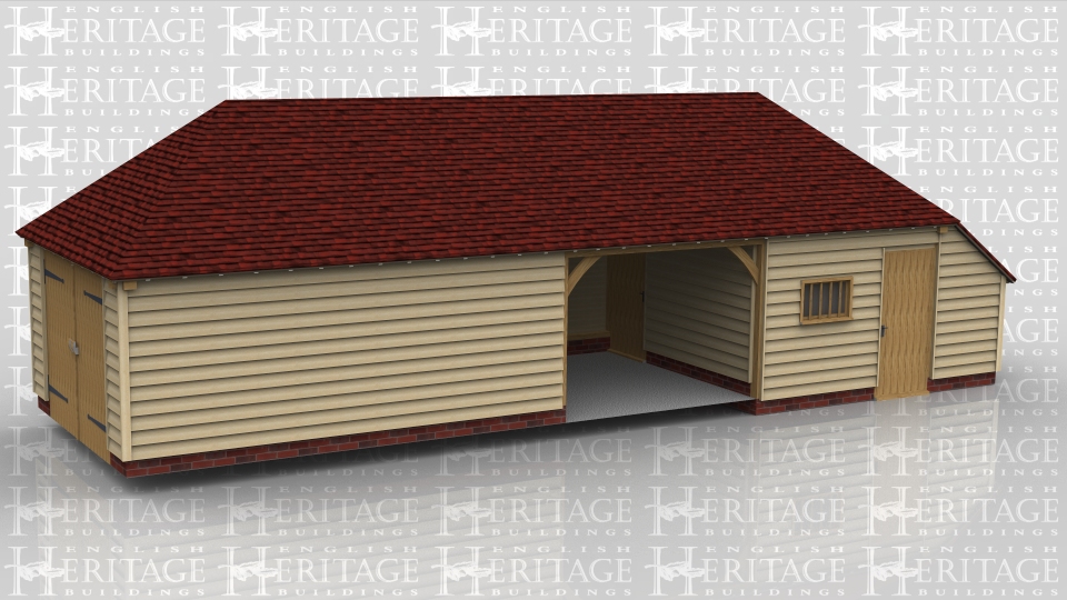 This oak framed garage has four bays, three enclosed and one open. Two of the enclosed bays are accessed by a set of garage doors to the left hand side. The third enclosed bay has a single door to the front and left side and a mullion window to the front. There is also an enclosed logstore to the side.