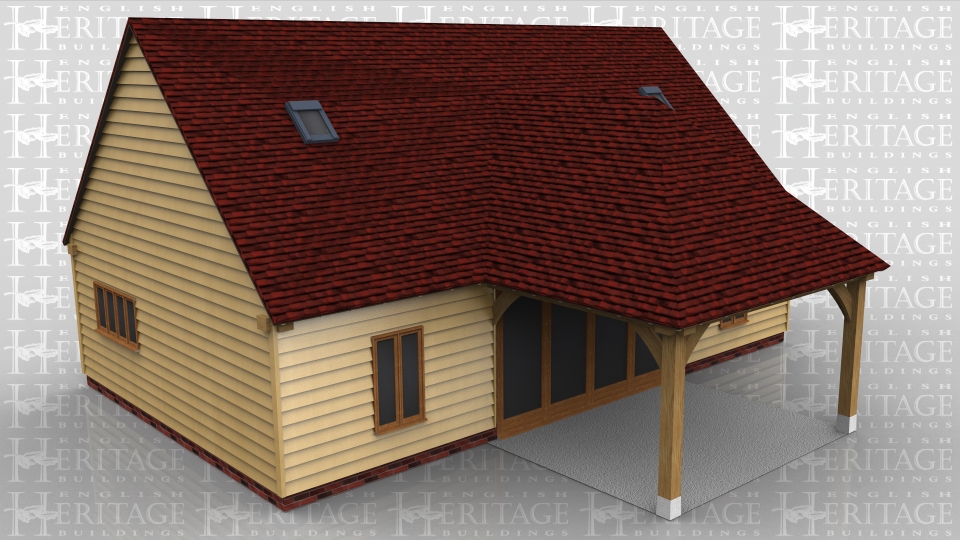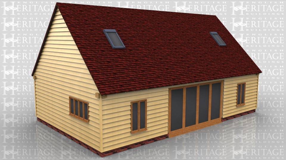 This oak framed home leisure building has three bays, with an extra open bay to the front to function as a porch. The middle bay has four full length garden room windows to the front and rear. The left and right bays have a two pane window to the front and rear and a four pane window to the side. There are trimmings for four rooflights.