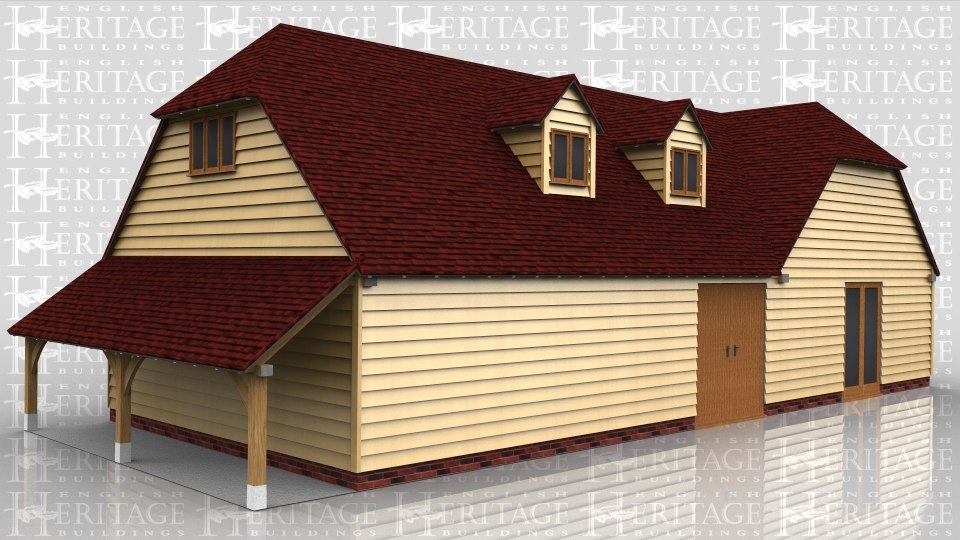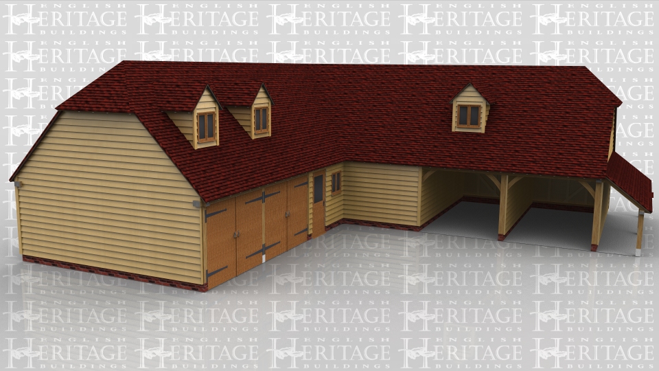 This oak framed two storey garage complex is formed of two different frames. The first frame is a five bay garage with two garage doors to the front and a half glazed single door. The other two bays are attached to the next frame and enclosed, with a set of garden room doors to the right side. To the first floor there are two dormers at the front with a two pane window in each. The next frame is a three bay garage with one enclosed bay and two open bays. On the first floor there is a dormer to the front and two to the rear, each with a two pane window. The enclosed bay has a pair of solid doors to the rear. To the right side there is an open store.