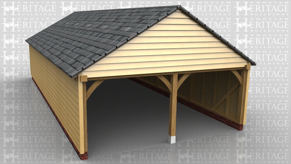 This oak framed garage has two enclosed bays. The bays are accessed via the right side of the building which is left open.