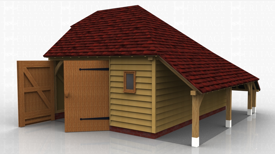 This oak frame garage has both an internal an external covered storage area with barn hip and hipped roof ends.