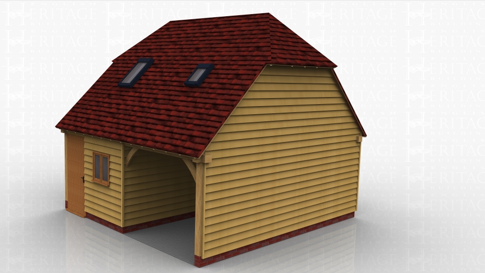 This oak framed two storey garage has two bays, one open and one enclosed. The enclosed bay is accessed by a single door to the front and has access to the first floor via a hatch. There are trimmings for two rooflights.