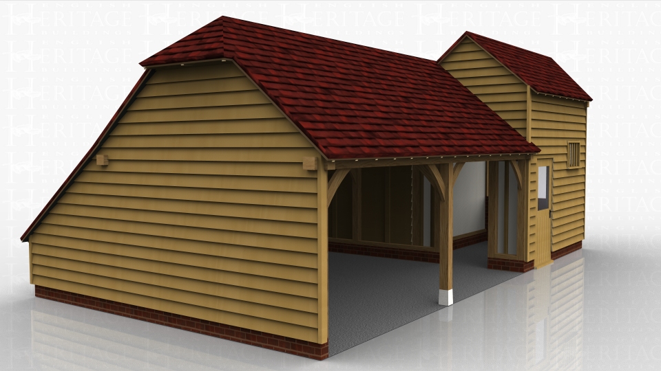 A 2 bay open garage with a link frame which attaches through to an existing building.