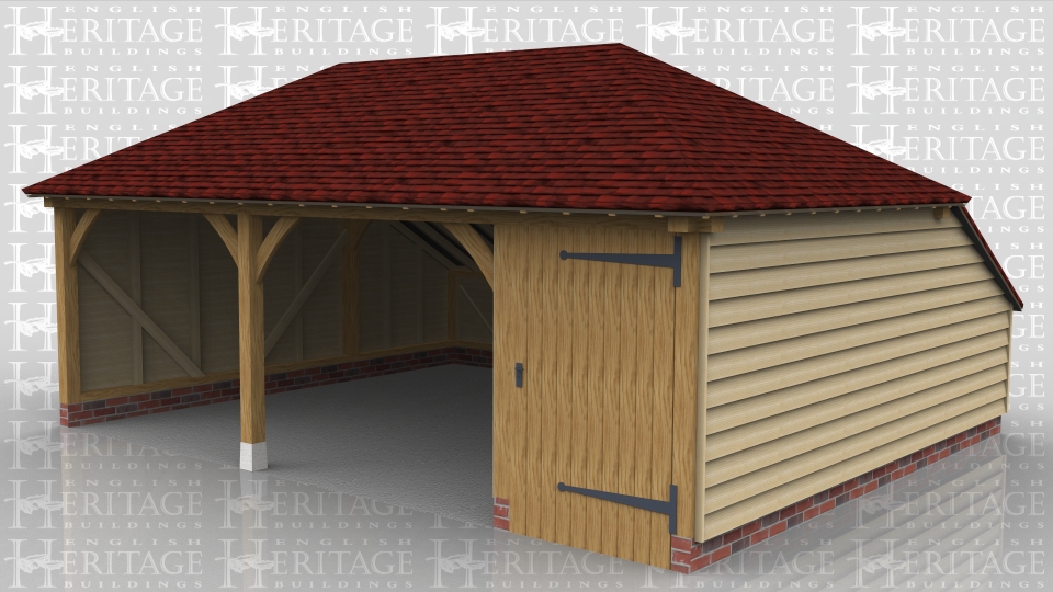 This oak framed garage is formed of three bays, two open and one smaller enclosed bay. The enclosed bay is accessed by a single door to the front, and the garage has an enclosed store to the rear.