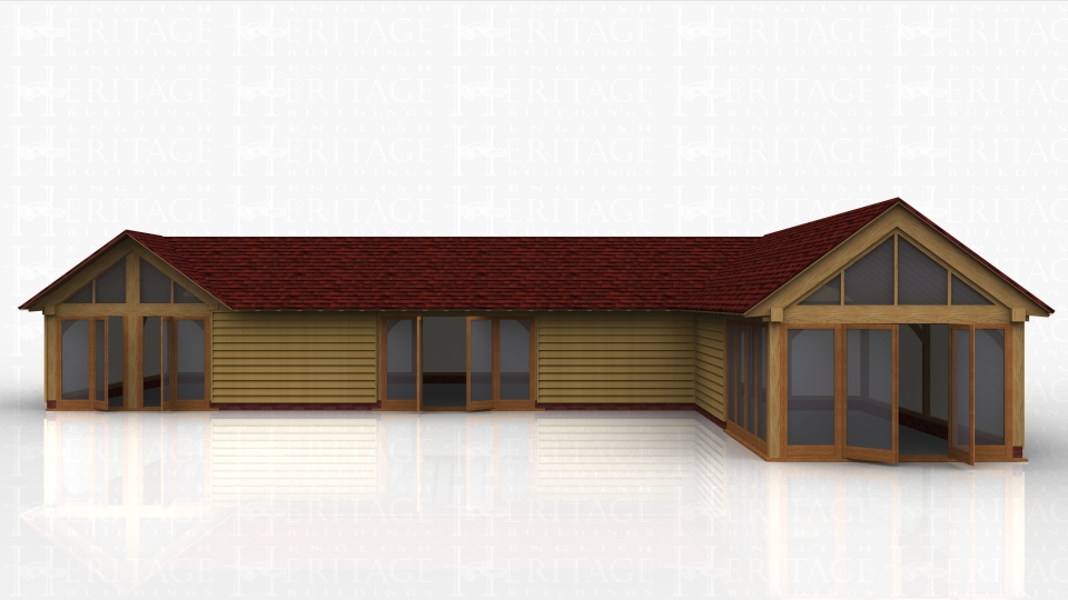 This oak framed complex is formed of three different frames. The first frame is formed of a three bay garden room with a glazed gable on the left side and a set of full length opening garden room windows. Attached to this frame is a three bay home leisure building with a set of opening garden room windows to the front. The third frame is a six bay home leisure building with full length glazing to the front of two bays and a glazed gable to the right end and full length opening garden room windows.