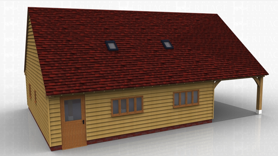 This oak framed garage has four bays, three are enclosed and one is half enclosed and half open. The small end bay is accessed by a half glazed single door and the other two bays have four pane windows to the front. The end bay has a set back partition making the bay open except for a small enclosed store to the rear. There are trimmings for two rooflights.