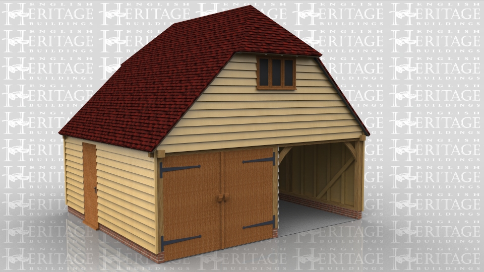 This oak framed two storey garage has two bays. Access is via the left hand side, with a set of garage doors and an open bay. To the rear there is a single door, and on the first floor left side there is a three pane window.